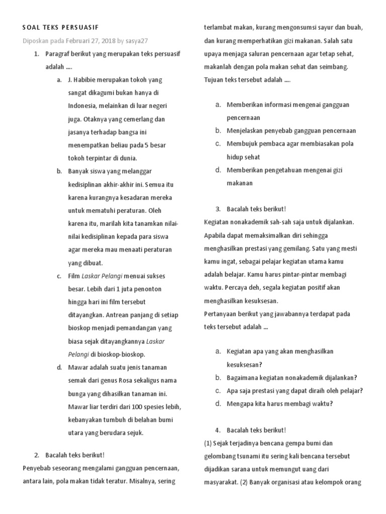 Teks Persuasif Pengertian Ciri Ciri Contoh Quipper Blog Contoh Soal Bahasa Indonesia Kelas 8 Tentang Teks Persuasi 40 Contoh Soal Pidato Pilihan Ganda Beserta Jawaban Kelas 9 Soal Teks Persuasif Docx Pdf Free Download Soal Teks Persuasif Rumah Baca Sasya Teks Persuasi Persuasion Text Syarat Syarat Penyusun Paragraf. 20201105 Soal-soal di bawah ini bisa kamu gunakan sebagai referensi atau bahan latihan untuk mengerjakan tugas dari guru dan juga untuk menghadapi ujian di sekolah. Jawablah pertanyaan pertanyaan berikut dengan memilih a b c atau d.