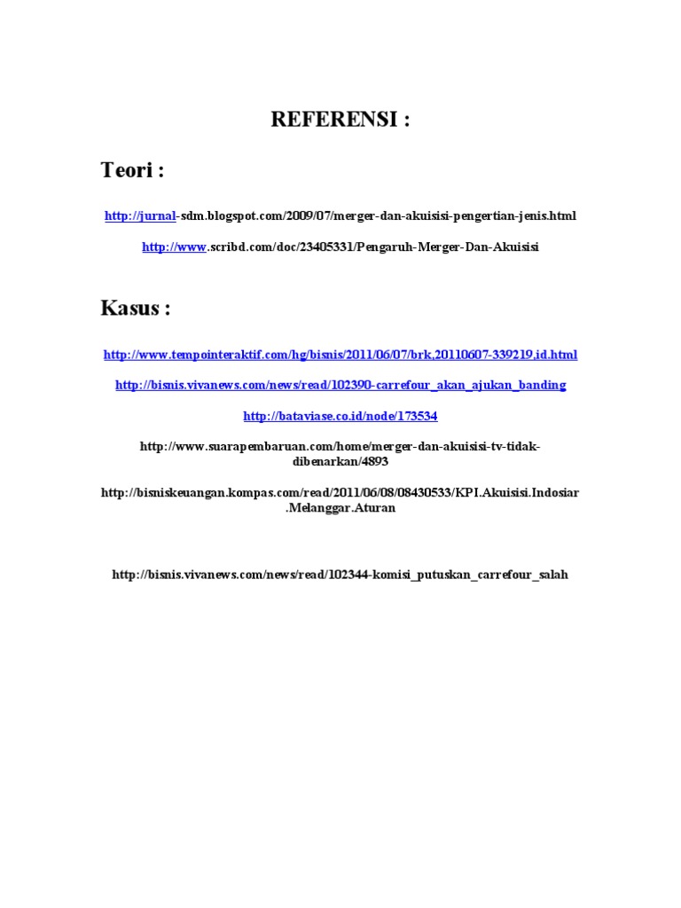 Report Makalah Merger dan Akuisisi Please fill this form we will try to respond as soon as possible. Undang-undang tersebut mengatur tentang merger akuisisi dan konsolidasi mulai dari Pasal 102 sampai dengan Pasal 109 plus Pasal 76 mengenai kuorum dan voting dalam Rapat Umum Pemegang Saham untuk merger. Merger konsolidasi akuisisi adalah hal yang sangat umum dilakukan agar perusahaan dapat memenangkan persaingan serta terus tumbuh dan berkembang.