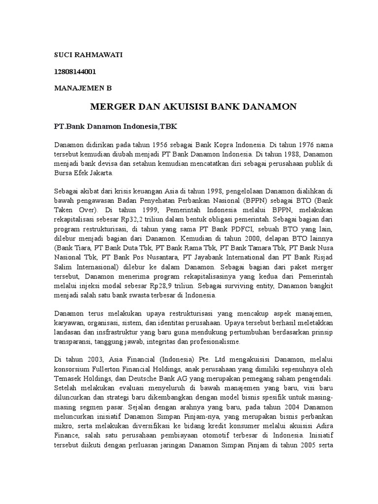 Tifani Ratu Firdaus SE MM Disusun oleh. View MAKALAH Merger Dan Akuisisi Kelompok 5doc from CIS MISC at Jenderal Soedirman University. Penyusunan makalah ini dimaksudkan untuk memenuhi tugas mata kuliah Hukum Perbankan Fakultas Hukum Universitas Kuningan dengan dosen pengampu Bapak Gios.