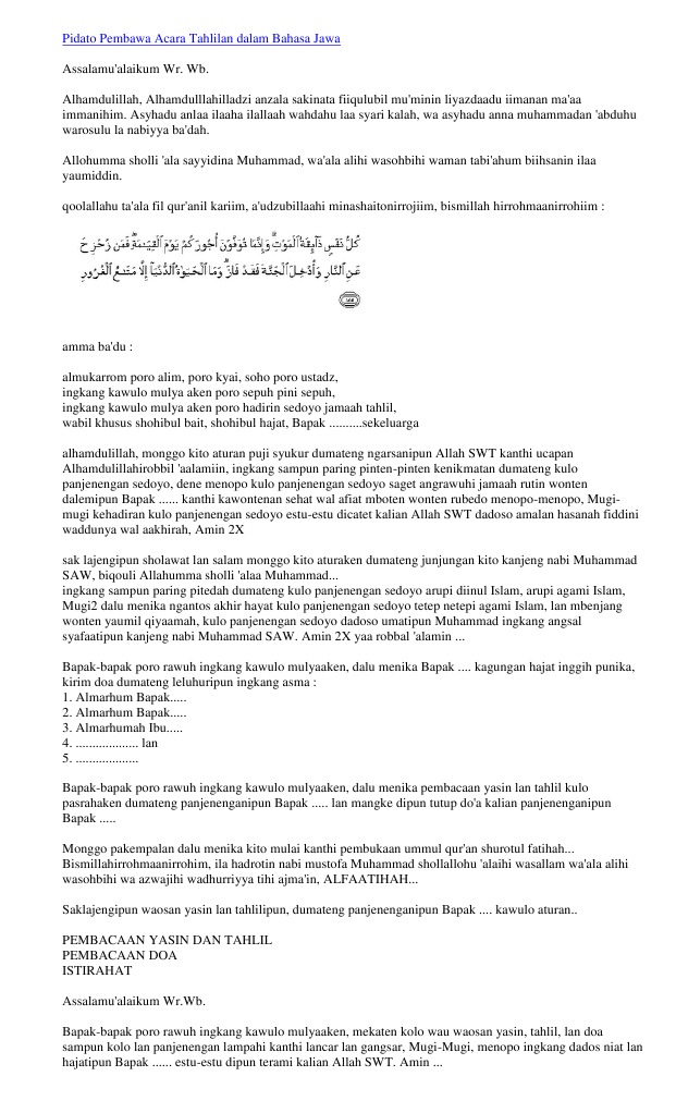 Bapak kepala sekolah tuwin bapak ibu guru ingkang dahat kinurmatan kula ingkang jinejer mingangka adicara langkung rumiyen badhe ngaturaken menggah urut reroncening adicara ingkang sampun rinacik dening para kadang panitia. Sugeng sonten wassalamualaikum wa rahmatullahi wa barakatuh. Contoh Teks Pranatacara Pernikahan 1.