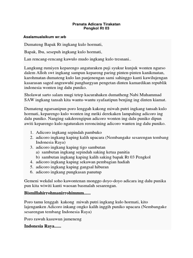 Contoh Teks Pranatacara Adicoro Pengantin Bahasa Jawa - Pada kesempatan kali ini saya akan memberikan contoh teks mc untuk acara pranatacara adicoro pengantin dalam bahasa jawa yang baik dan benar. Contents1 Contoh Naskah Pranata Acara Halal Bihalal11 Contoh Teks Pranatacara Hari Guru12 Contoh Teks Pranatacara. Pranatacara uga diarani pambyawara pranata adicara utawa pranata laksitaning adicara.